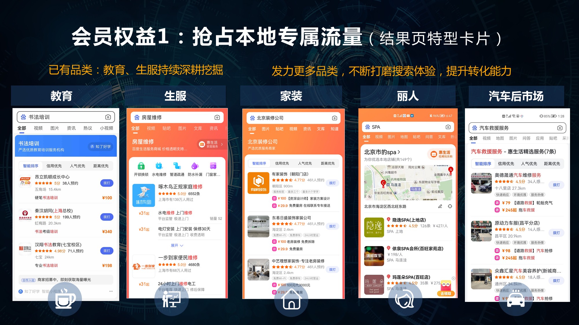 本地會(huì )員是面對中小商家的普惠型獲客解決方案,用海量專(zhuān)屬流量扶持本地商家成長(cháng),面向五大品類(lèi)開(kāi)放會(huì )員產(chǎn)品售賣(mài),分別為:生活服務(wù)、教育培訓、房產(chǎn)家居、汽車(chē)服務(wù)和麗人。