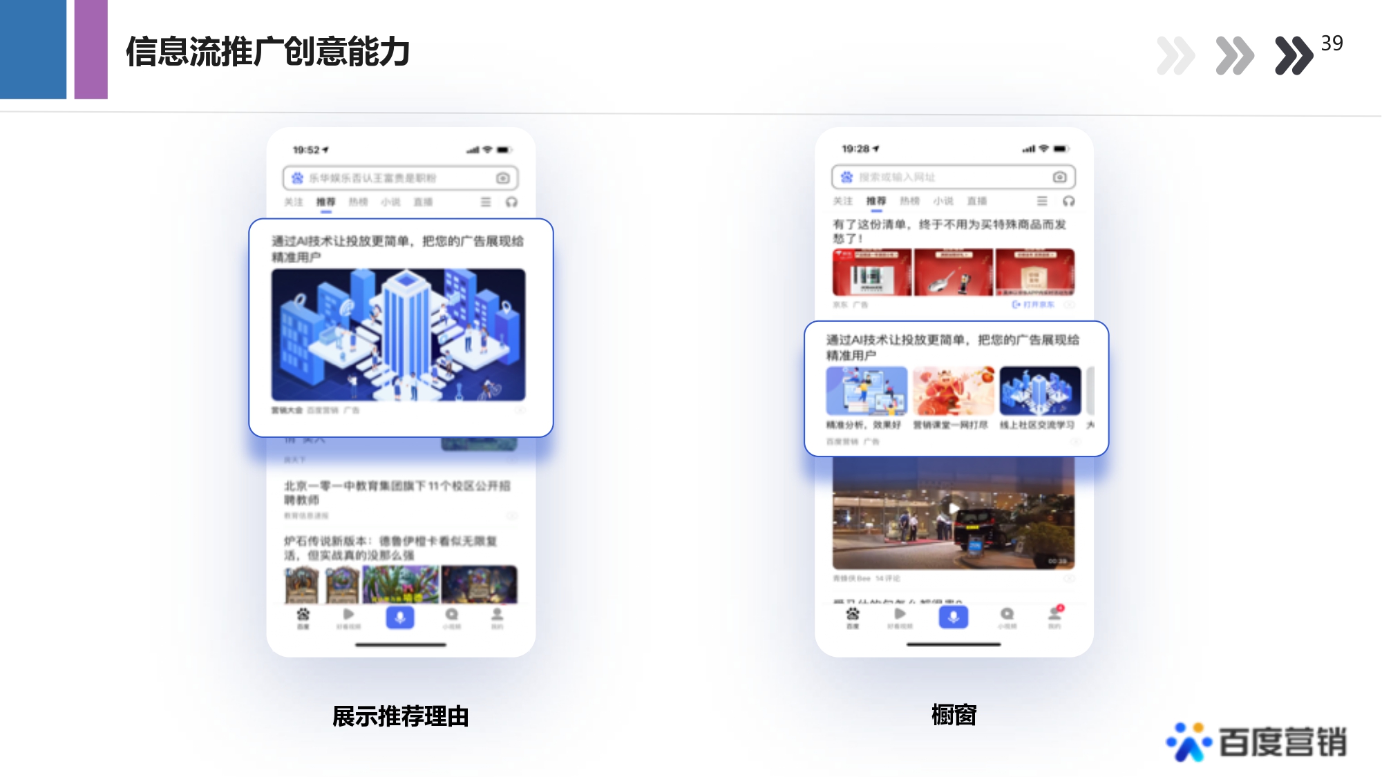 信息信息流廣告是在百度APP、貼吧等百度資訊流中穿插的原生廣告,通過(guò)“搜+推”雙引擎,將您的推廣信息自然融入在各類(lèi)資訊、信息中,易傳播、易操作。